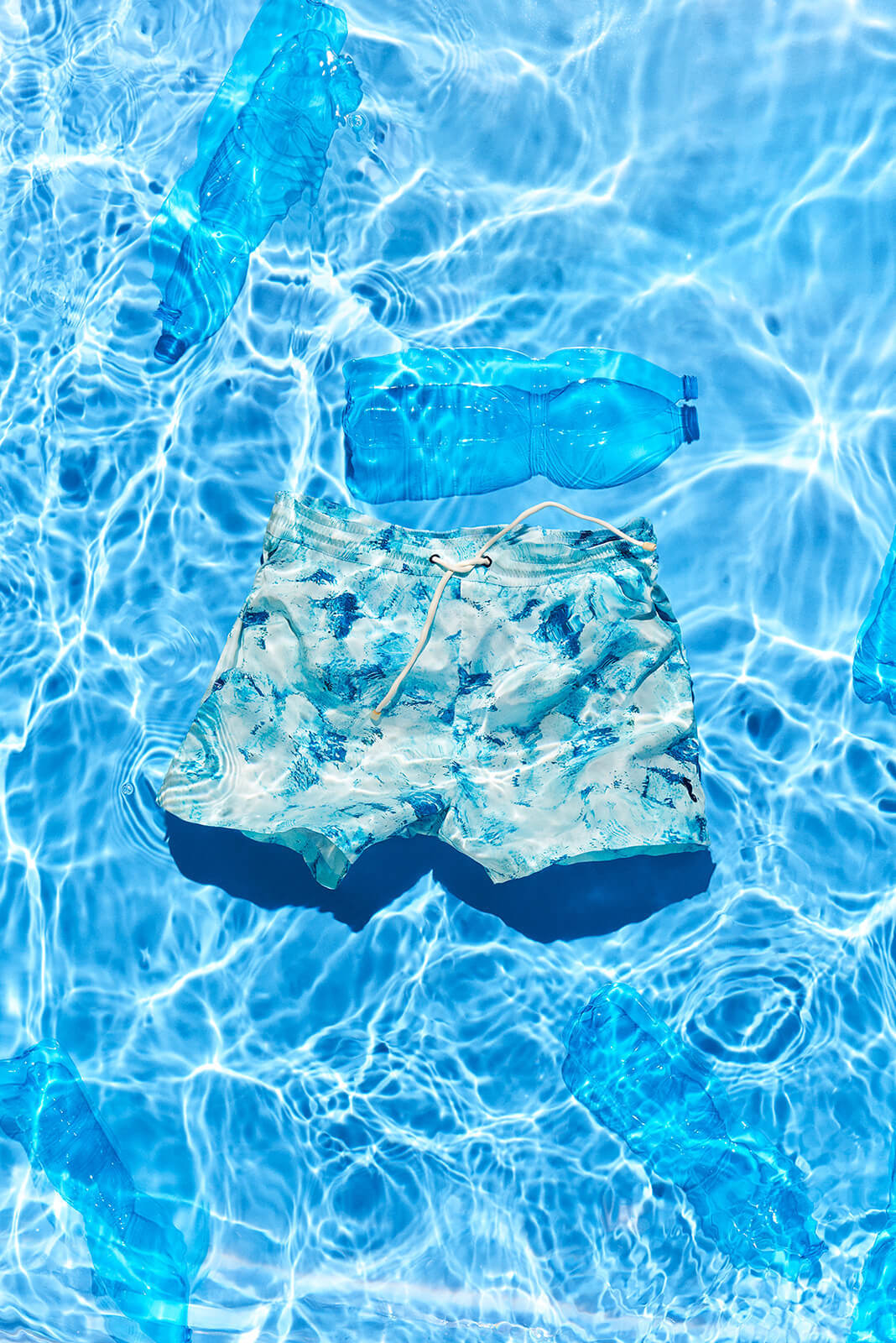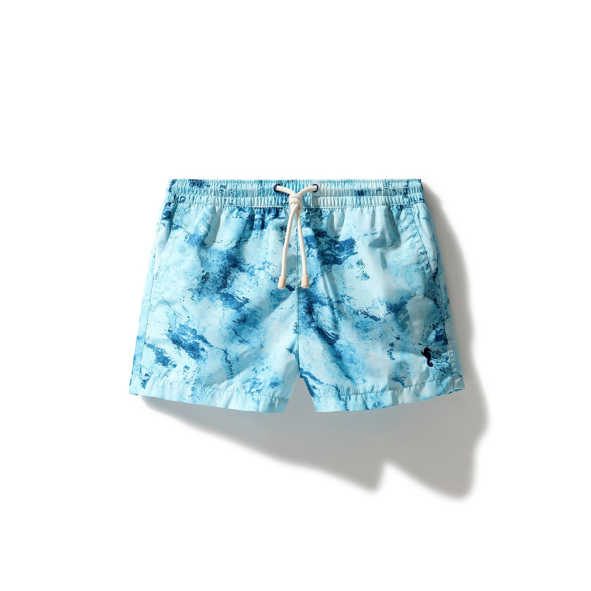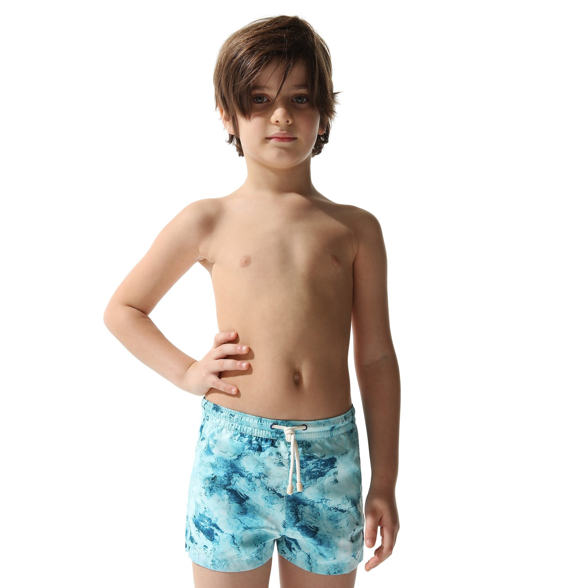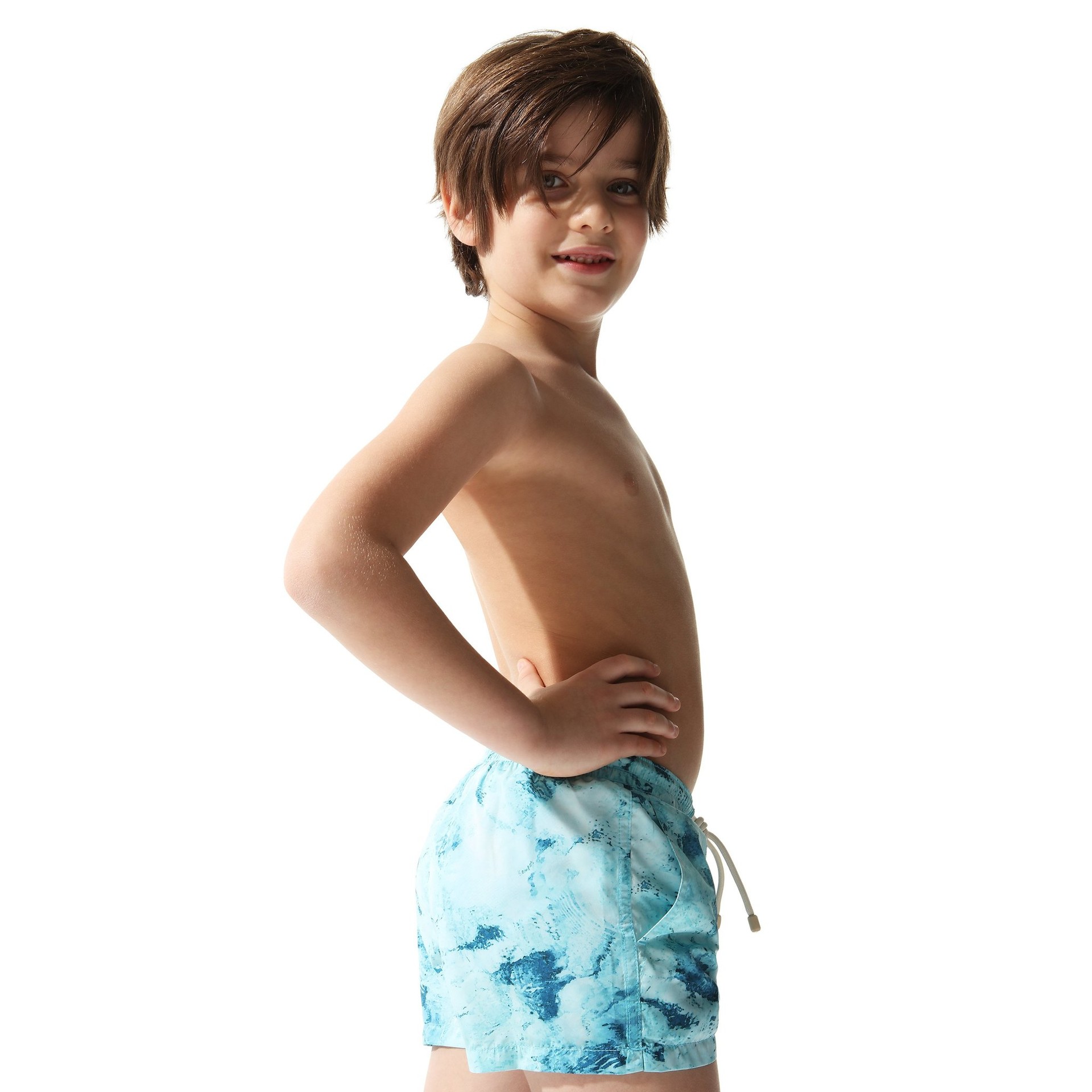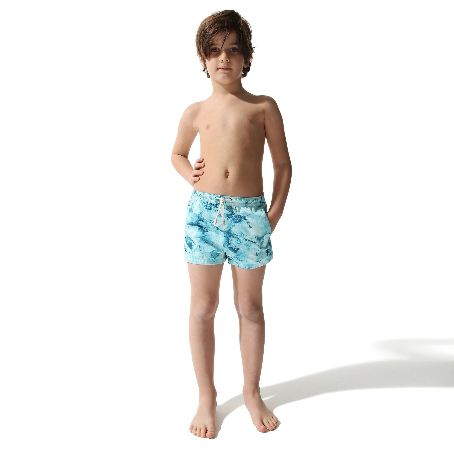 그리스 미코노스 섬의 맑은 바닷물에서 볼 수 있는 다양한 색조의 블루 컬러에서 영감을 받은 ‘키즈 스윔 쇼츠 워터’ 는 플라스틱 페트병을 재활용한