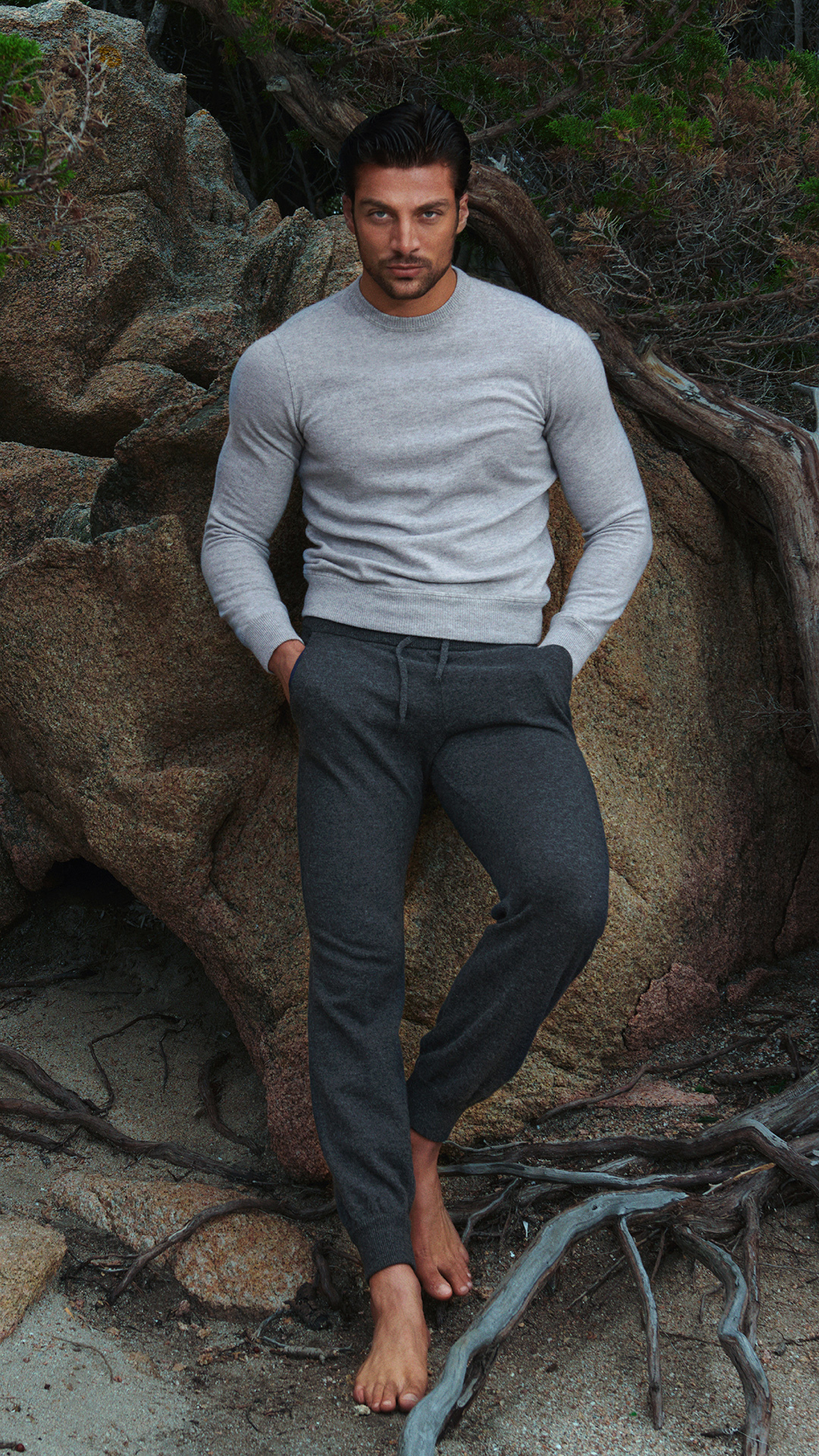 캄포스의 다크 그레이 캐시미어 조깅 팬츠는 지중해 연안에 서식하는 돌고래의 밝은 회색에서 영감을 받았습니다.