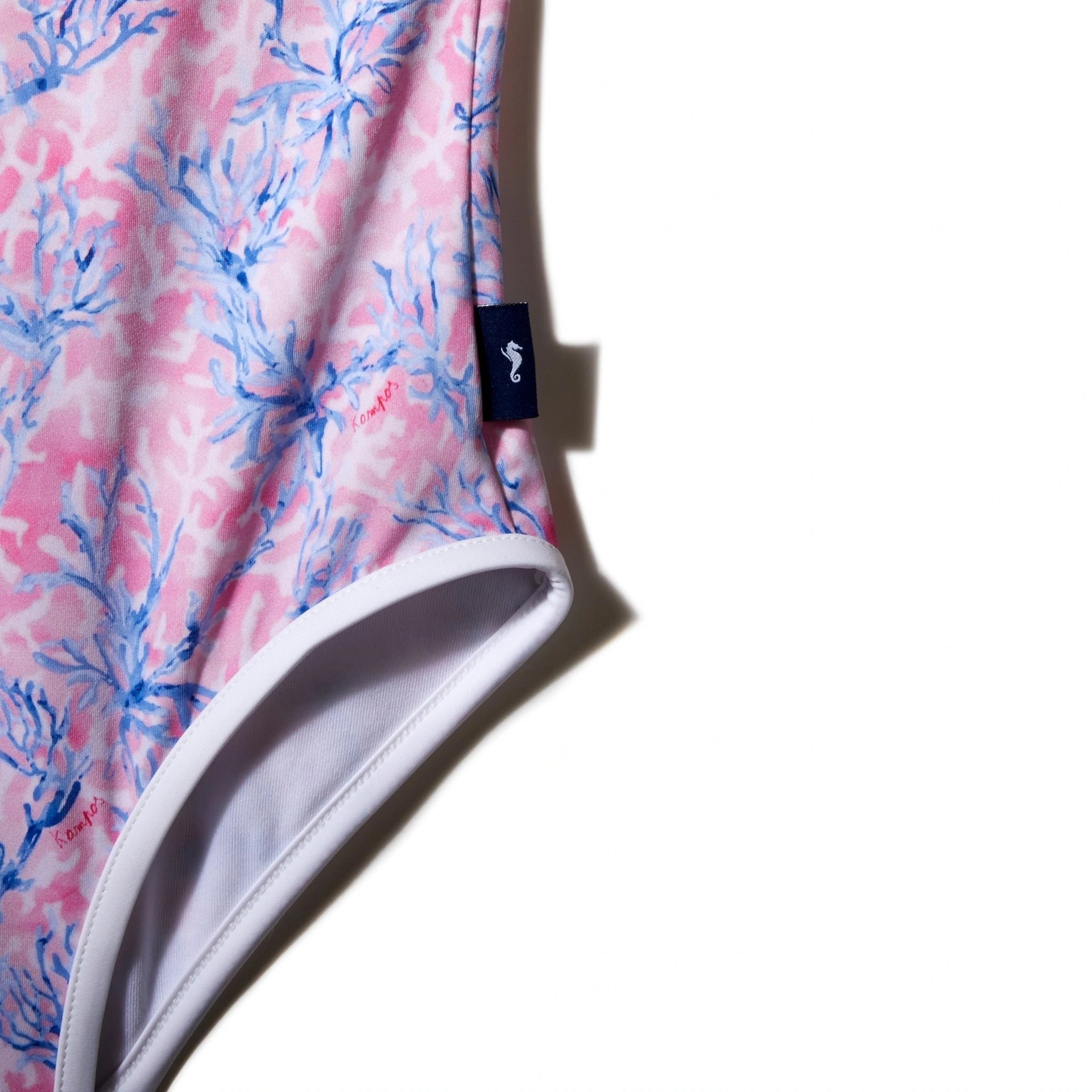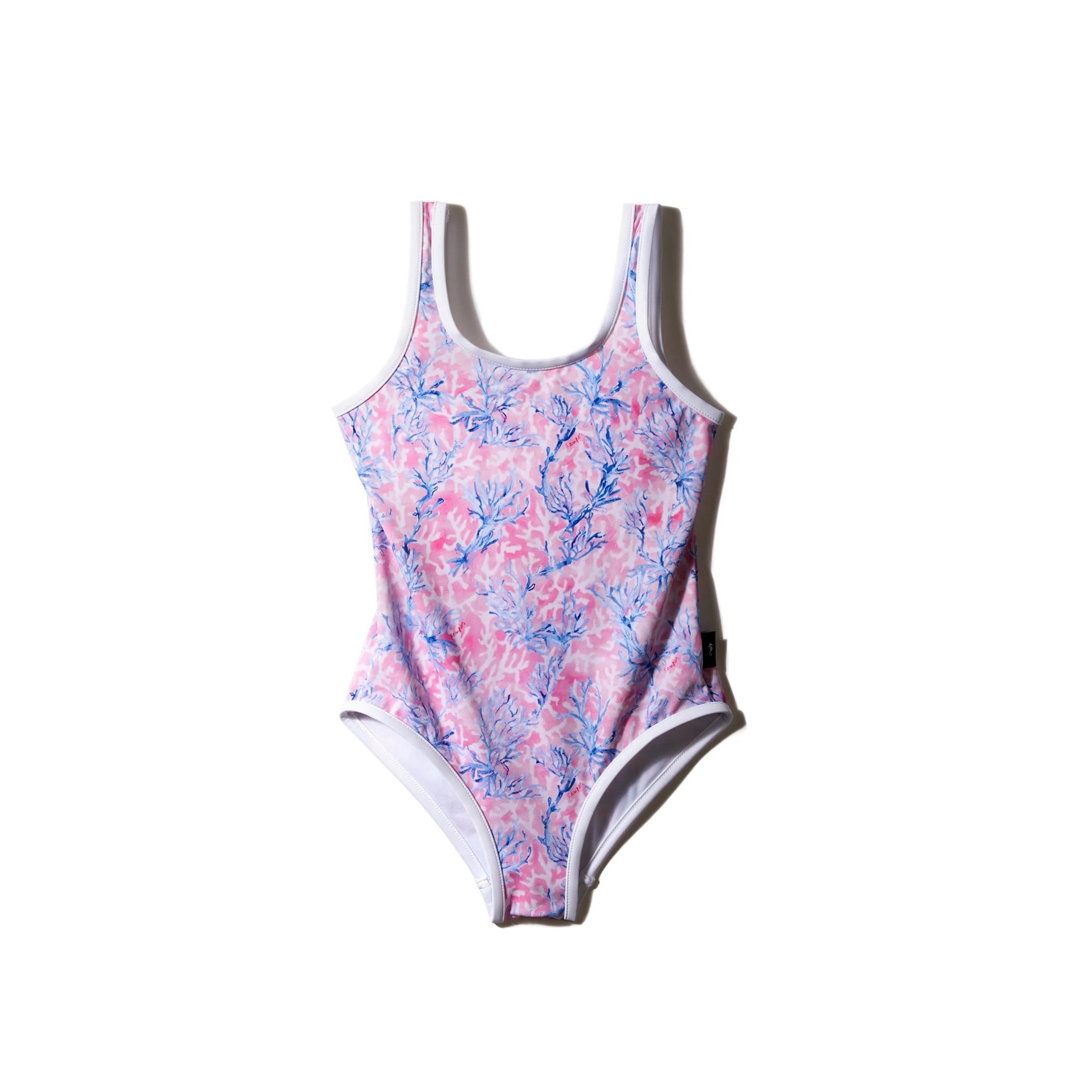 캄포스의 '키즈 올림픽 스타일 코랄 포레스트 핑크' 수영복은 멸종 위기에 처한 아름다운 산호초로부터 영감을 받았습니다.
